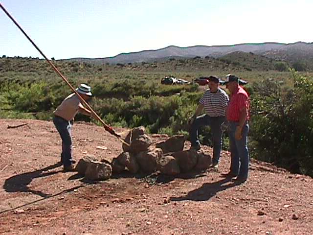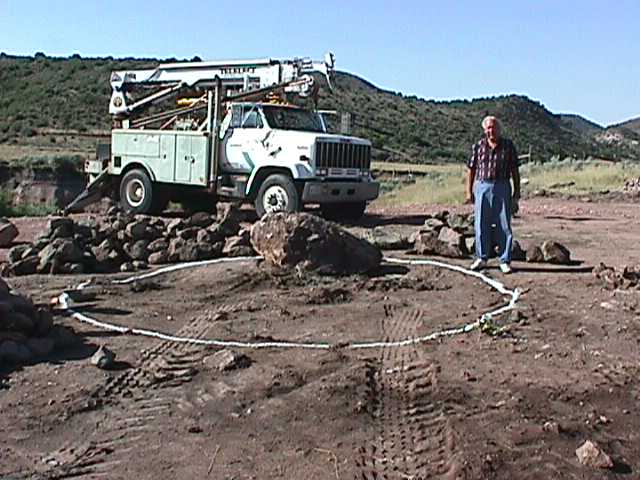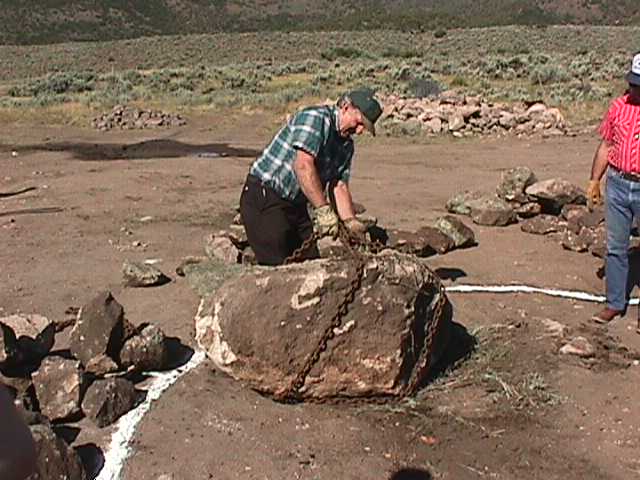10.jpg (34609 bytes) 8. Placing of the first stone. The white chalk line is the outline of the future cairn to be built to Carleton's original