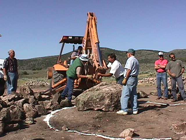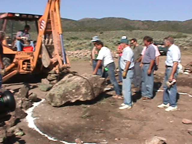 16.jpg (37994 bytes) 11. Backhoe operator, James Poet. Use of the tractor was donated by Progressive Contractors of St. George. 17.jpg (48205 bytes) 12. Master stone mason, Ronnie Sims, makes final adjustments of first stone.