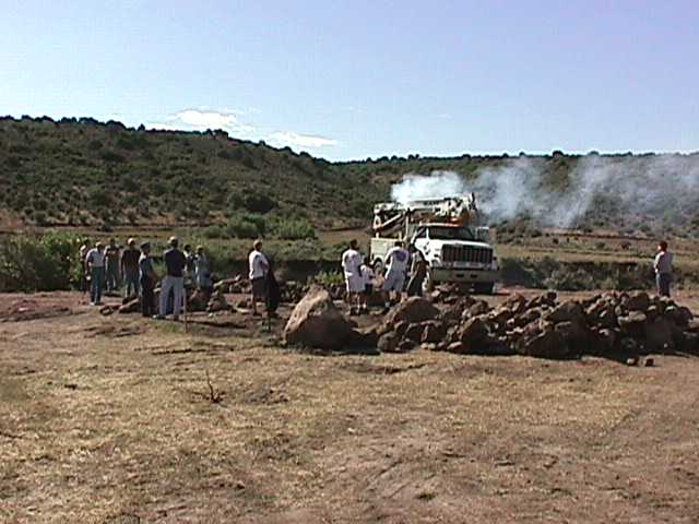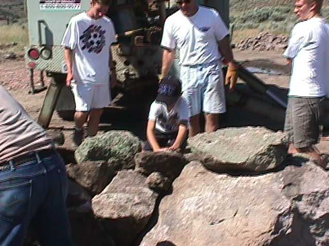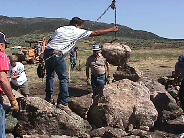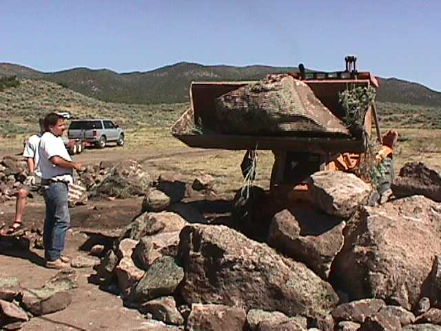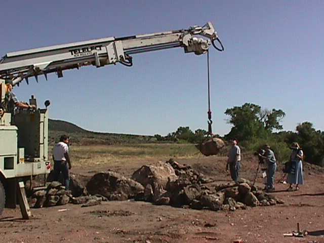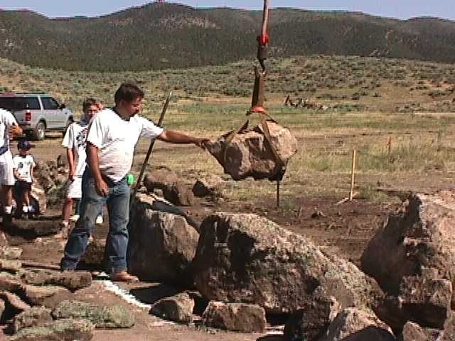 24.jpg (34839 bytes) 4.  Mr. Poet readies the first rock for placement by the crane