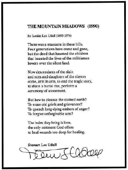 following poem: The inscription on the Mountain Meadows Memorial that was dedicated onSeptember 15, 1990:IN MEMORIAMIn the valley below,