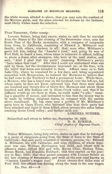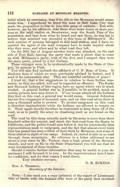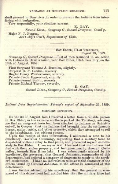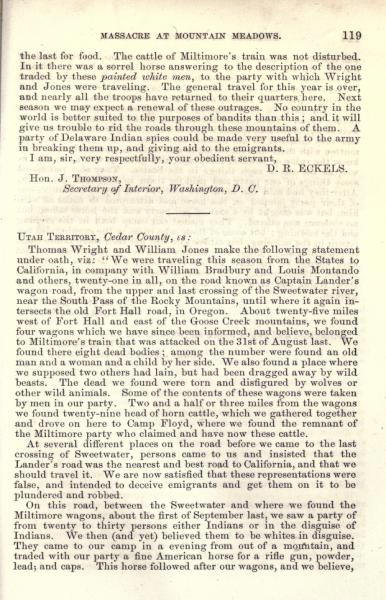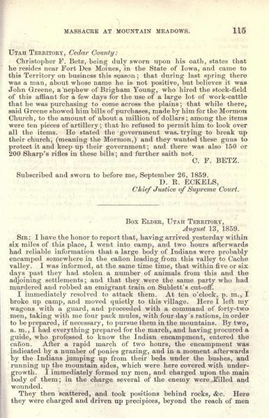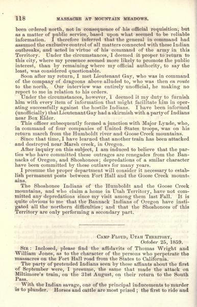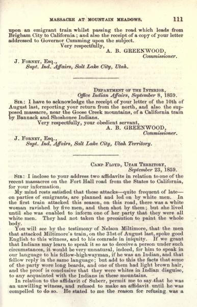 Message of the President of the United States: In compliance with a resolution of the Senate, information in relation to the massacre at Mountain Meadows, and other massacres in Utah Territory (May 1860)