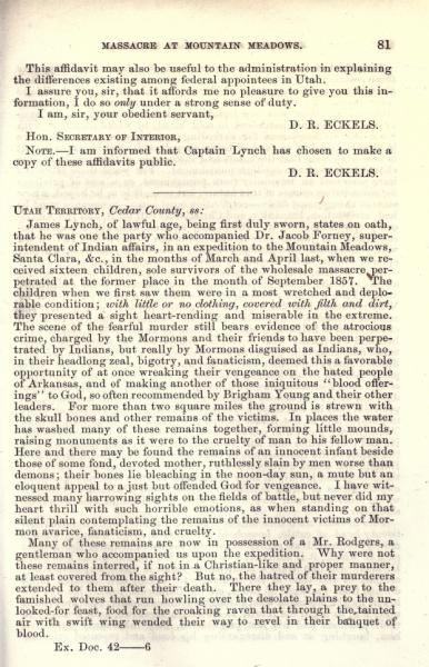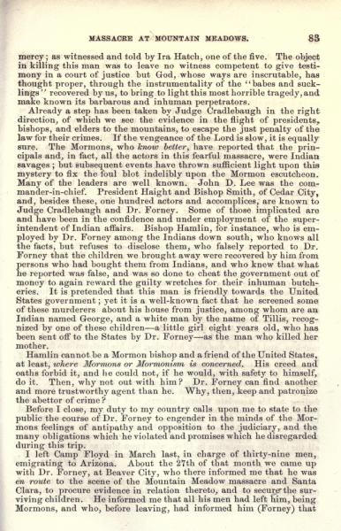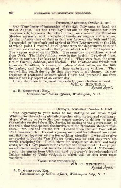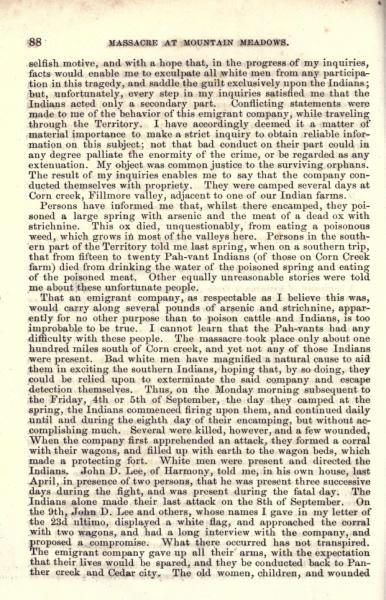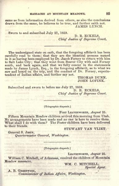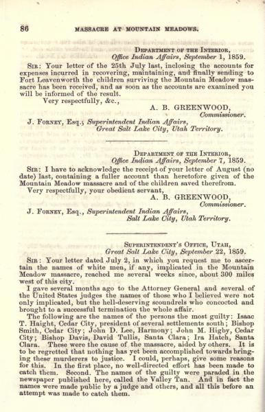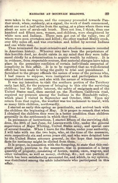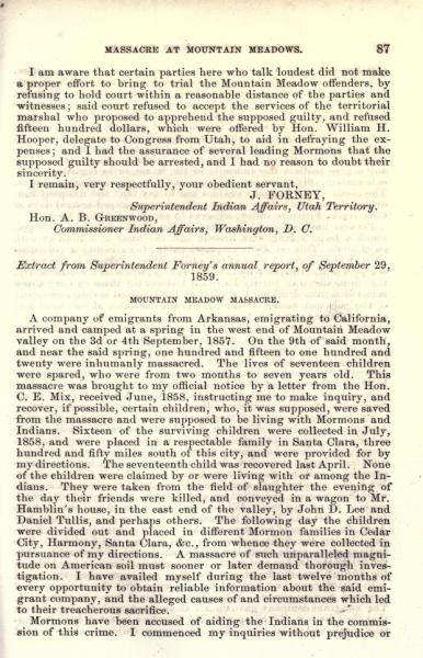 Message of the President of the United States: In compliance with a resolution of the Senate, information in relation to the massacre at Mountain Meadows, and other massacres in Utah Territory (May 1860)