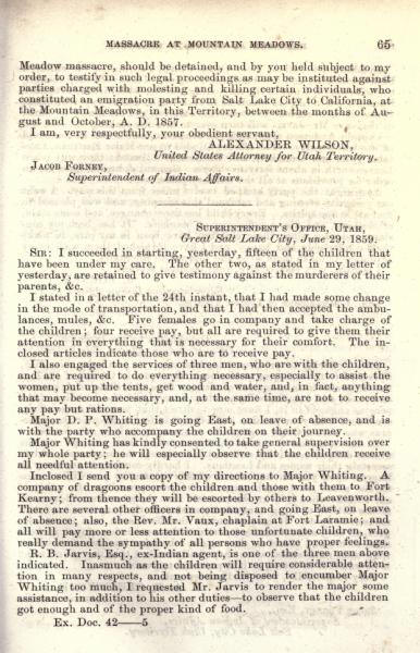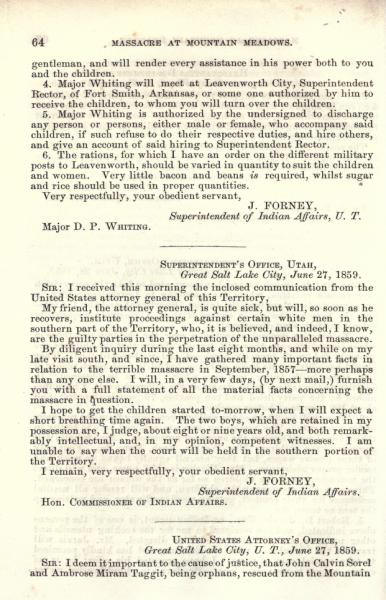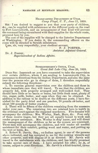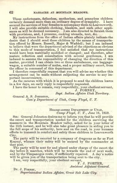 Message of the President of the United States: In compliance with a resolution of the Senate, information in relation to the massacre at Mountain Meadows, and other massacres in Utah Territory (May 1860)